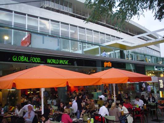 But it's with the 'global food' that the eclecticism really gets going. Perusing the menu, I'm torn between Vietnamese Yellow Chicken and Summer Squash Curry, Japanese Crisp Fried Tiger Prawns, or Tangy and Spiced Turkey Enchiladas. And what to have on the side? Wok-Fired Edamame; Hot Cheddar-Garlic Focaccia Bread; or Spicy Feta, Pumpkin, Spinach and Kalamata Olive Salad? Just what genre of food is this? As with the music, anything seems possible as long as it's a bit other (coming not from here), but not too alien; a bit vernacular (no high art music, no haute cuisine), but neither too brash nor too plain (no heavy metal, no muzak; most dishes mildly spiced). Again, the whole point seems to be to evoke a cosy global village that's everywhere and nowhere. Even the more homely Chopped Aberdeen Angus Steak Burger seems exotic when it joins its cosmopolitan companions, Mexican Grilled Chicken and Chorizo Burger, and 'Oz' Lamb Burger, in the global meta-place of the Giraffe concept. |